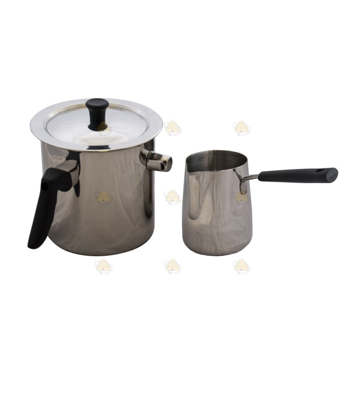 Si vous voulez vraiment vous lancer sérieusement dans le travail de la cire d'abeille, ces deux accessoires sont pratiquement indispensables. L'ensemble est composé d'une petite burette à cire en acier inoxydable de 700 ml et d'un fondoir en acier inoxydable de 1700 ml. La petite burette est idéale pour verser avec précision les bonnes petites quantités de cire d'abeille, etc. Le fondoir à double paroi et en acier inoxydable/INOX (hauteur intérieure 14 cm) est parfait pour fondre la cire d'abeille. La double paroi est remplie d'eau, ce qui permet de chauffer la cire au bain-marie. Cela empêche la cire de devenir trop chaude et préserve ainsi la qualité de la cire d'abeille. Le fondoir à cire fonctionne également sur une plaque à induction et, pour des raisons de sécurité, nous recommandons d'utiliser la casserole sur une plaque électrique (pas de flamme nue).