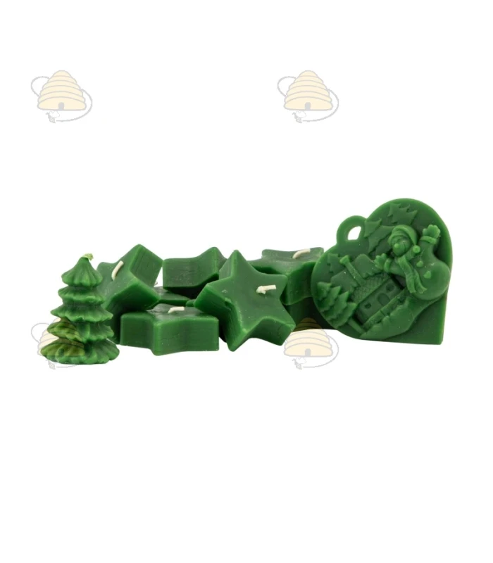 - trois moules à bougie en silicone (sapin de Noël, bougie à suspendre paysage hivernal et une plaque en silicone pour réaliser 8 petites bougies en forme d’étoile)