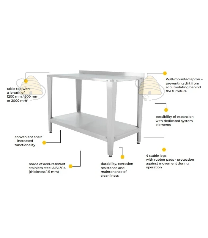 Table de travail de 200 cm de large. Meuble durable, hygiénique et résistant à la corrosion pour votre espace de production de miel. Une table de travail idéale pour la désoperculation des cadres ou la filtration de votre miel.