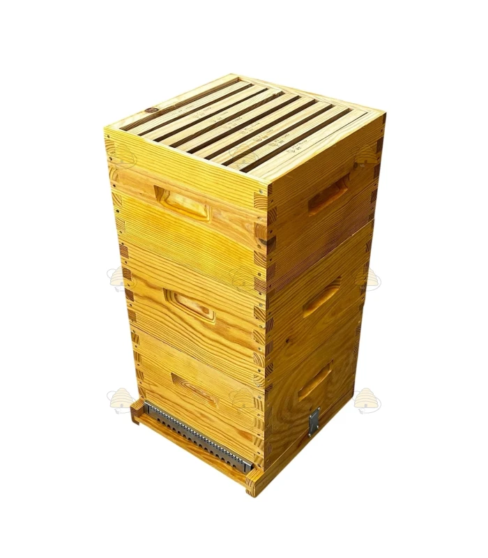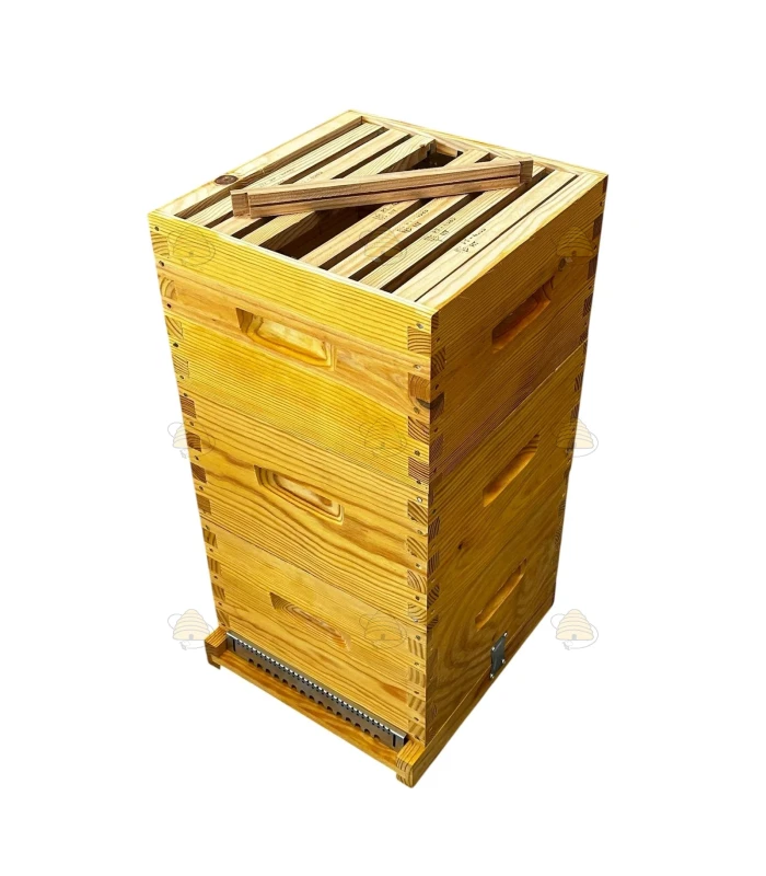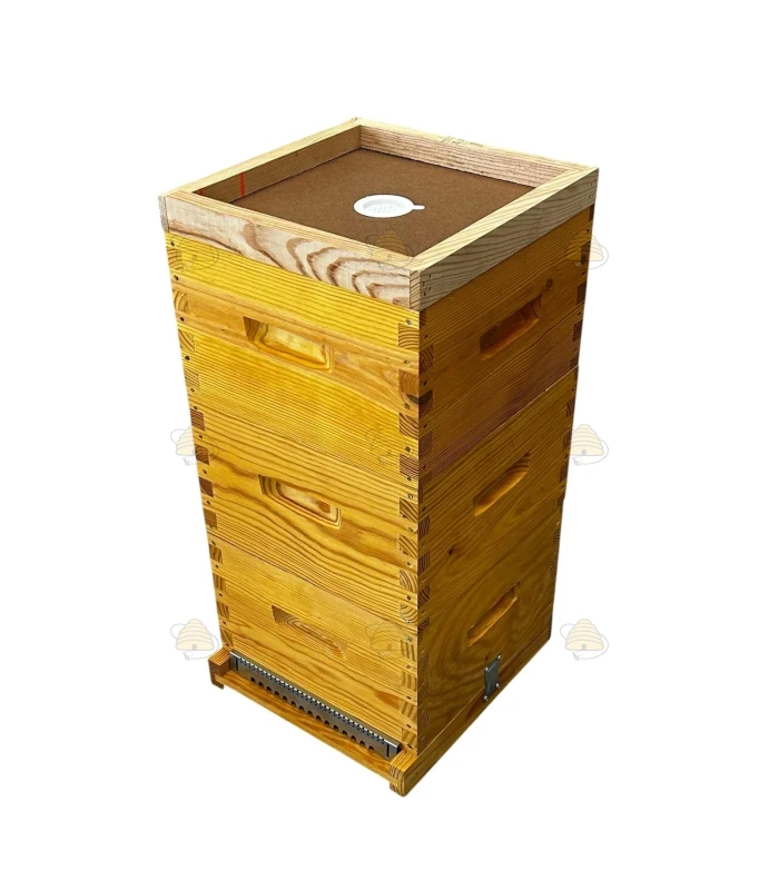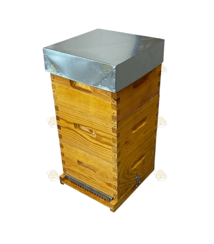 Cette ruche comprend : un plancher en bois, 3 corps de 8 cadres, 3 jeux de barres supérieures (8 pièces), des bandes d’écartement, un couvre-cadres, un toit et une porte d’entrée réglable.