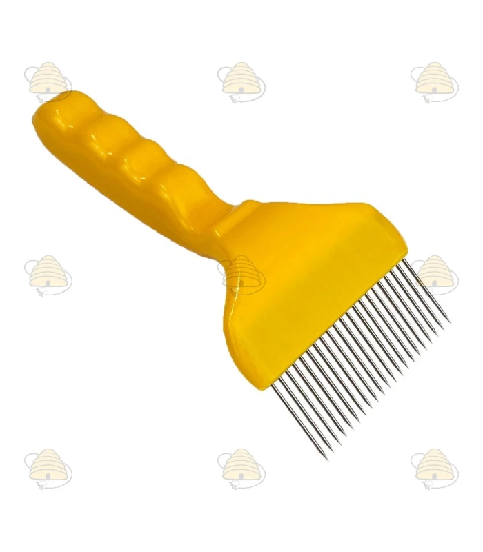 Cette petite herse à désoperculer est dotée de dents droites en acier inoxydable (inox) et mesure 19 cm de long au total.