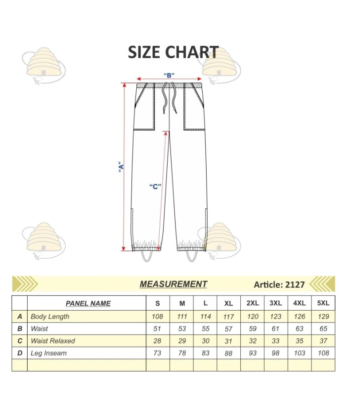 Pantalon d'apiculteur en coton au tissage serré en blanc. Idéal pour vous protéger lors du travail avec les abeilles ou lors de l'extraction du miel. Ce pantalon est robuste et grâce à sa coupe, il est également bien aéré. Le pantalon est muni d'un élastique et d'un cordon pour le resserrer au niveau de la taille, et il possède 2 poches à l'arrière et 2 poches à l'avant.