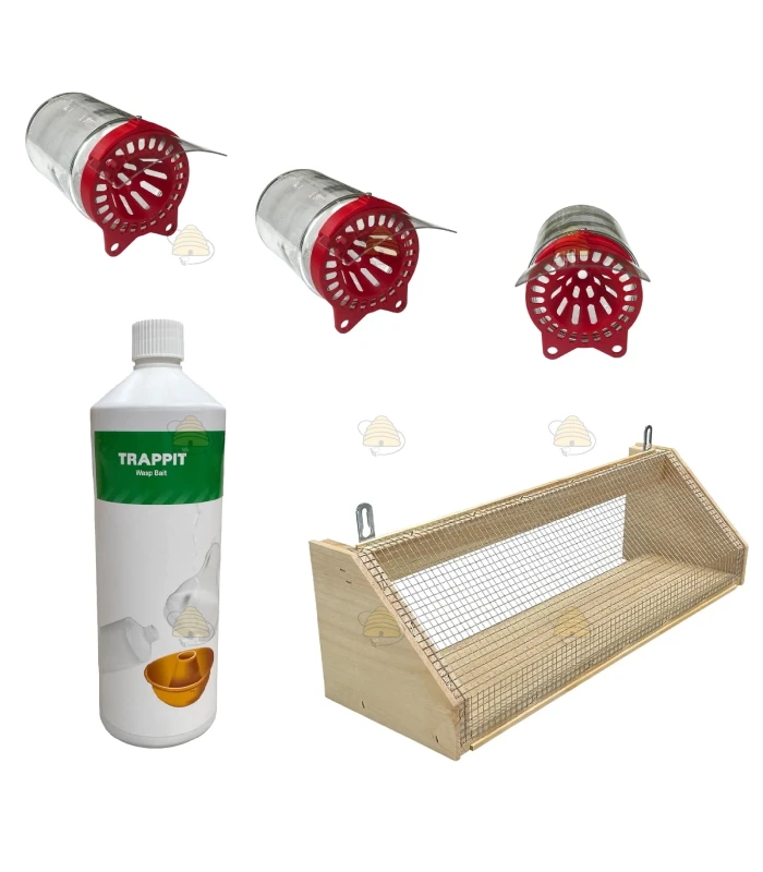 Pack de démarrage contenant tout le nécessaire pour lutter contre le frelon asiatique. Dans ce pack, vous recevrez trois pièges à frelons asiatiques, un litre d’attractif et une muselière en bois anti-frelons compatible avec nos modèles de ruches Spaarkast. La muselière anti-frelons présente les dimensions intérieures suivantes : 42,4 cm de large x 9,8 cm de haut.
