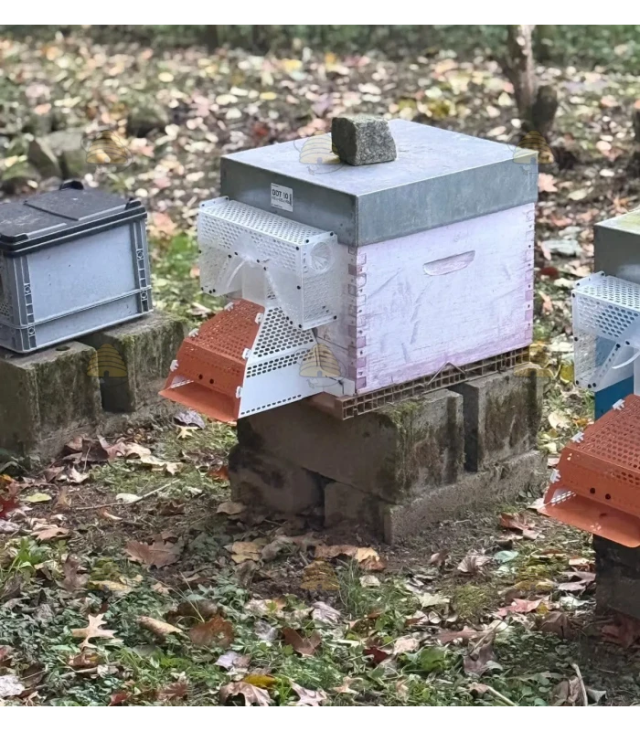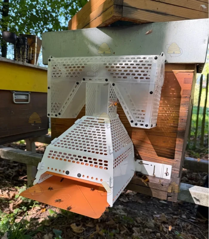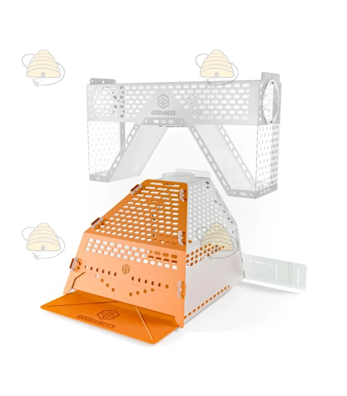 Les parois sont rendues opaques pour réduire le stress des abeilles, le piège est sélectif, la cage offre un débit d’entrée et de sortie très élevé pour votre colonie.