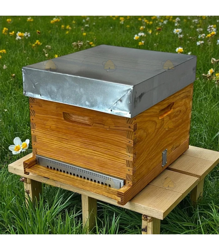 La ruche se compose d’un plancher en bois, d’un corps 10 cadres, de 10 cadres de corps, de bandes d’écartement, d’un peigne métallique, d’un couvre-cadres, d’un toit et d’une porte d’entrée coulissante.