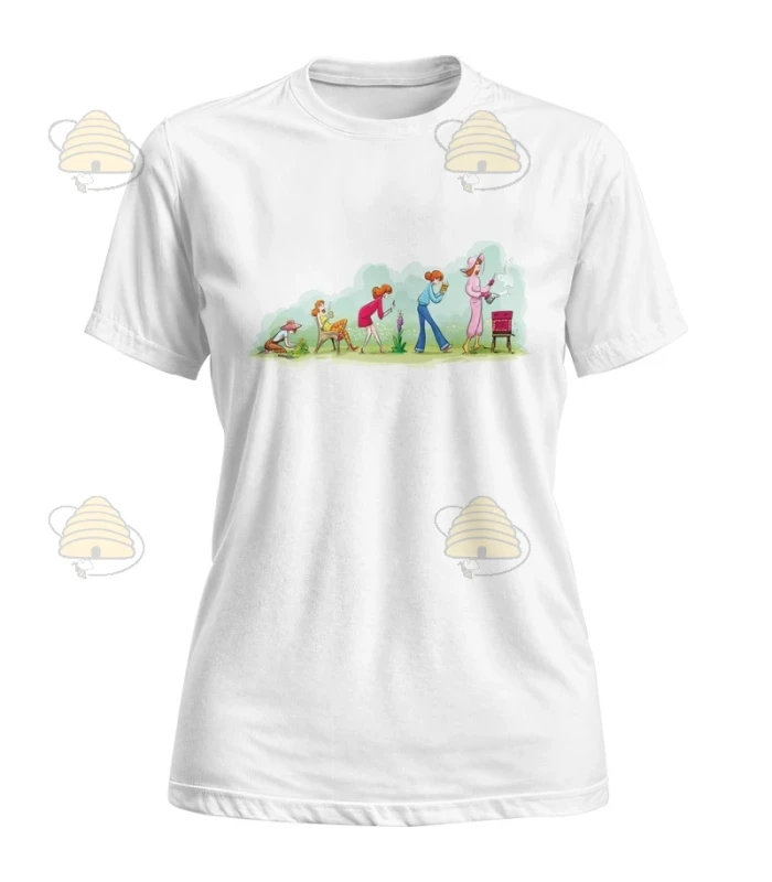 T-shirt blanc avec illustration de l’évolution de l’apicultrice – de la première apicultrice primitive jusqu’à l’apicultrice moderne. Un hommage à la relation millénaire entre l’humain.e et l’abeille. Fabriqué en 100 % coton avec une impression de haute qualité, garantissant confort et durabilité.
